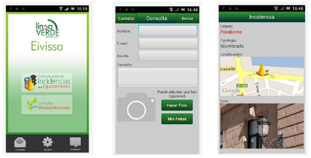 Los ciudadanos pueden comunicar incidencias en el equipamiento urbano mediante la aplicación móvil. Para ello el ciudadano seleccionará una categoría de equipamiento, a la que podrá adjuntar un fotografía concreta sobre el desperfecto, realizada desde supropio móvil, y el dispositivo detectará las coordenadas exactas en las que se ubica por geolocalización en el momento, o manualmente si prefiere generar el aviso después, además de realizar sus comentarios u observaciones sobre la incidencia generada.