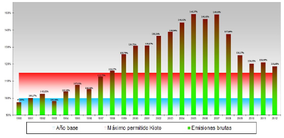 A continuación se muestra en el siguiente gráfico la evolución de las emisiones de GEI en España.