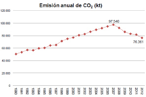 En concreto, el dióxido de carbono (CO2) emitido a la atmósfera por el uso del transporte creció de manera considerable hasta 2007. A partir de ese año, el uso de biocombustibles (bioetanol y biodiesel) se incorporan a la flota automovilística contribuyendo a una considerable reducción; en torno a 21.000 Kilo toneladas de CO2 hasta 2012.